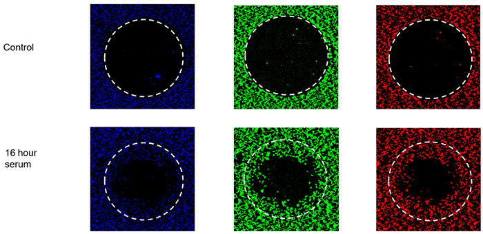 細胞排斥區分析(間隙封閉法)是Platypus公司獲得專(zhuān)利的技術(shù)。讓細胞在孔的底部圍繞一個(gè)阻止細胞生長(cháng)的區域(如在孔底部中央放置阻塞物)生長(cháng),實(shí)驗在移除阻塞物后開(kāi)始,可觀(guān)察單層細胞遷移到原先的空白區域中。