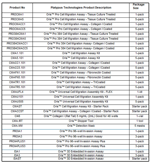 美國Platypus Technologies公司建立于2000年,是細胞分析領(lǐng)域產(chǎn)品的耗材供應商,熱賣(mài)產(chǎn)品為OrisTM和OrisTM Pro系列細胞遷移和侵襲實(shí)驗試劑盒。其開(kāi)發(fā)的用于檢測細胞遷移和侵襲的細胞排斥區分析法,克服了Transwell和劃痕實(shí)驗的缺點(diǎn)。