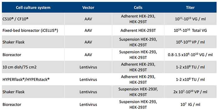 不管細胞培養體系和生產(chǎn)規模如何, PEIpro?和PEIpro?-HQ 均可獲得較高的病毒產(chǎn)量,慢病毒的病毒滴度超過(guò)107IG/mL,而AAV的病毒滴度超過(guò)109 VG/mL。