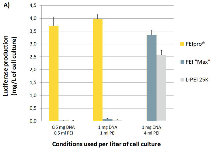 圖3.與其它PEIs相比,PEIpro?所需更少轉染試劑和較少/相似的DNA用量