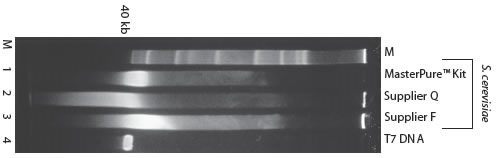 1%瓊脂糖膠電泳分析不同試劑盒提取純化啤酒酵母的500ng DNA,使用EB進(jìn)行染色。用MasterPure? Kit分離的DNA的大小絕大多數在40-50 kb范圍內。用其它試劑盒提取的DNA會(huì )降解成更小的片段。