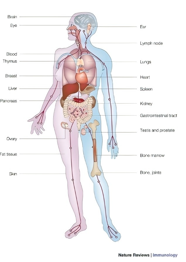 起初,T 細胞被認為是免疫系統中 MIF 的主要細胞來(lái)源。然而,后來(lái)的文獻證明了單核細胞、巨噬細胞、血液中的樹(shù)突狀細胞、B 細胞、中性粒細胞、嗜酸性粒細胞、肥大細胞和嗜堿性粒細胞均表達MIF。值得注意的是,MIF 也由與宿主自然環(huán)境直接接觸的細胞和組織表達,例如肺、皮膚上皮層以及胃腸道和泌尿生殖道。其另一個(gè)顯著(zhù)特征是在內分泌系統的幾個(gè)組織中高水平表達,尤其是參與應激反應的器官(下丘腦、垂體和腎上腺)。