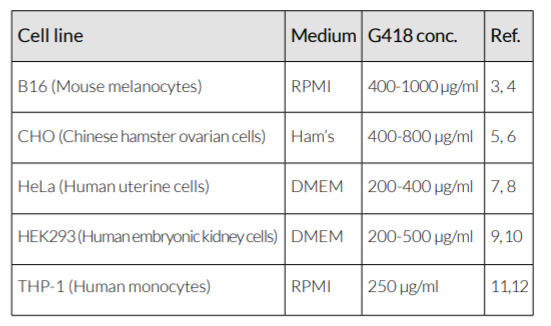 InvivoGen建議的工作濃度:G418通常以400 μg/ ml的濃度使用。當然仍需要為您的細胞確定最佳濃度。下面列出了常見(jiàn)哺乳動(dòng)物細胞使用G418篩選的濃度(參見(jiàn)下表)。
