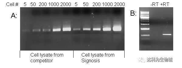 圖2 A: 比較Signosis與其他品牌的細胞裂解液。分別對裂解產(chǎn)物中的β-actin進(jìn)行30個(gè)循環(huán)反轉錄PCR。