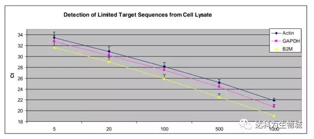 隨著(zhù)HeLa細胞數的增加,分別用適量細胞裂解液裂解細胞后進(jìn)行反轉錄,而后在7700 PCR儀上進(jìn)行Actin、GAPDH和B2M基因的3復孔qPCR反應。