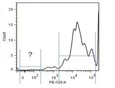 補償調節抗體的正確選擇對于熒光通道之間的補償調節是非常重要的。要求選擇的抗體所結合的抗原分子在樣本細胞中有明確表達,占樣品細胞的10%以上,50%以下。如果陽(yáng)性細胞比例太低,在陽(yáng)性細胞區域無(wú)法形成明顯的細胞團,無(wú)法判斷調節是否合適。如陽(yáng)性細胞比例過(guò)高,則不表達該抗原的陰性細胞無(wú)法形成明顯的細胞團,如圖1-4直方圖所示。