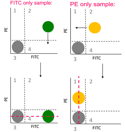(3)PE單染管:同理,將進(jìn)入FITC探測器的PE信號通過(guò)補償調節來(lái)消除。