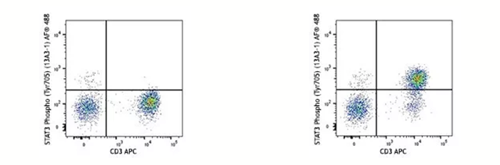 在蛋白翻譯后修飾(磷酸化、乙?;?、甲基化等)的研究過(guò)程中,固定劑不僅可以有效的“固定”住翻譯后修飾的位點(diǎn)(絲氨酸、蘇氨酸、酪氨酸等),也可以防止目標位點(diǎn)在活細胞中很快降解(比如磷酸酶會(huì )去除磷酸化修飾、去甲基化酶會(huì )移除甲基化修飾等)。下面的例子是用IL-6的重組蛋白刺激人外周血15分鐘后看STAT3第705位酪氨酸的磷酸化水平,在刺激完樣本后就需要通過(guò)固定來(lái)實(shí)現目的氨基酸磷酸化水平“停留”在IL-6刺激15分鐘這個(gè)節點(diǎn)上。