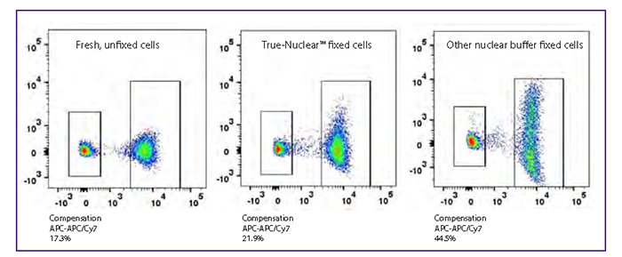 主要表現在固定劑對串聯(lián)染料(tandem-dye,如APC/Cy7、PE/Cy7等)的影響:一個(gè)是固定劑有可能造成串聯(lián)染料的斷裂,比如APC-Cy7和4%多聚甲醛溶液接觸時(shí)間超過(guò)4個(gè)小時(shí)染料就有可能斷裂,所以如果細胞直接重懸在固定液里面建議盡快上機,如果要放到第二天上機,需離心去除固定液后重懸在流式染色液或者是PBS里面,當然有一些新的串聯(lián)熒光素可以有效減少這種情況,比如BioLegend的APC/Fire750TM染料。