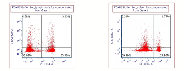 用BioLegend FOXP3 Buffer set對細胞進(jìn)行固定破膜處理后,染Ki-67抗體,左圖:小鼠淋巴結樣本;右圖:小鼠脾臟樣本。