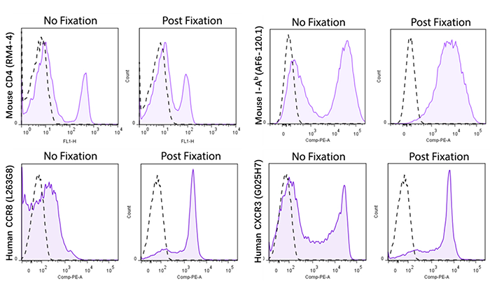 流式實(shí)驗中,有一些情況我們希望或需要對樣本進(jìn)行預先固定處理,比如前文說(shuō)過(guò)的傳染病人的樣本或者是需要檢測蛋白翻譯后修飾的樣本。對于需要預固定的樣本,首先需要考慮預先固定處理對檢測指標的影響,有很多指標先染色再固定和先固定再染色出來(lái)結果差異非常大,導致這些差異原因和指標的類(lèi)型、抗體的克隆號等因素都有關(guān)系。