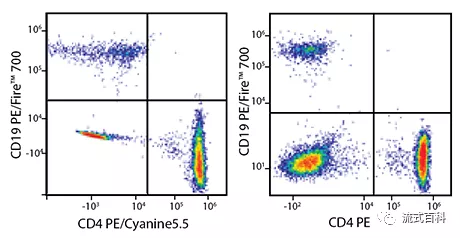 在5激光Cytek? Aurora 光譜流式平臺上,檢測人裂紅后外周血的CD4和CD19。PE/Fire? 700-CD19和PE/Cyanine5.5-CD4共染方案與PE/Fire? 700-CD19和PE-CD4共染方案得到了相似得陽(yáng)性信號,說(shuō)明在光譜流式平臺PE/Fire? 700和PE/Cyanine5.5是有可能在一個(gè)panel中共用的,但是配色方案可以更加優(yōu)化。