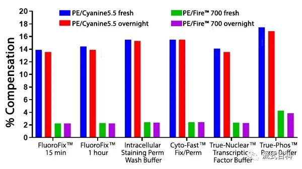 PE/Fire? 700 和PE/Cyanine5.5標記的兩種CD4抗體檢測人裂紅外周血,抗體孵育完成后在固定洗滌馬上去檢測條件下和過(guò)夜后的條件下,在5激光Cytek? Aurora 光譜流式平臺檢測,PE/Fire? 700 在不同的實(shí)驗方案中對多聚甲醛的固定具有穩定的抗性,表現出比PE/Cyanine5.5更優(yōu)秀的穩定性,但是在磷酸化指標的檢測方案中,PE/Fire? 700熒光素的穩定性出現了一定程度的下降。