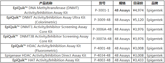 Epigentek還為您提供表觀(guān)遺傳相關(guān)的DNMT, HDAC和HAT核提取物檢測試劑盒。