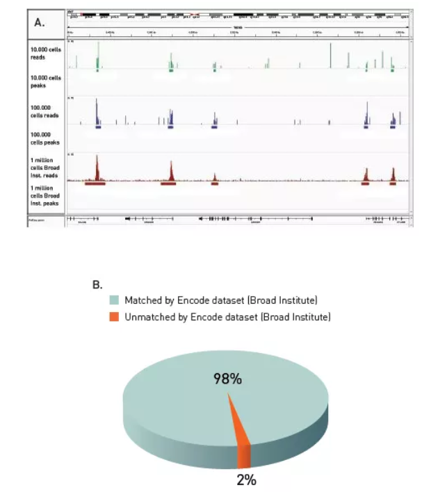A、用Diagenode的H3K4me3抗體、True MicroChIP Kit進(jìn)行ChIP實(shí)驗,10000個(gè)細胞中ChIP下來(lái)17pg DNA,對照組35pg DNA。IP下來(lái)的DNA用MicroPlex Library Preparation Kit擴增并被轉化為可用于Illumina?平臺測序的文庫,通過(guò)IlluminaR Genome Analyzer分析文庫,根據說(shuō)明書(shū)進(jìn)行簇生成和測序。