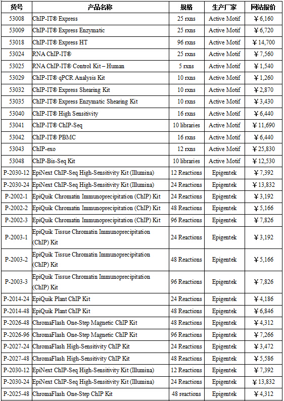 染色體免疫共沉淀( Chromatin Immunoprecipitation , ChIP )是基于體內分析發(fā)展起來(lái)的方法,也稱(chēng)結合位點(diǎn)分析法,它能真實(shí)、完整地反映結合在DNA序列上的調控蛋白,是目前確定與特定蛋白結合的基因組區域或確定與特定基因組區域結合的蛋白質(zhì)的好方法,這項技術(shù)幫助研究者判斷在細胞核中基因組的某一特定位置會(huì )出現何種組蛋白修飾。ChIP技術(shù)和芯片技術(shù)的結合有利于確定全基因組范圍內染色體蛋白的分布模式以及組蛋白修飾情況。該技術(shù)主要應用于:1.組蛋白修飾研究 2.轉錄調控分析 3.藥物開(kāi)發(fā)研究 4.有絲分裂研究 5.DNA損失與凋亡分析。
