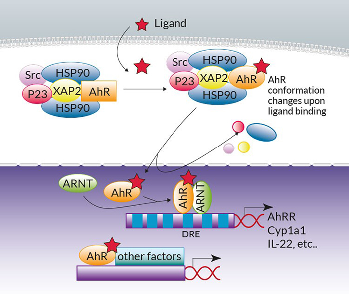 典型AhR訊號已經(jīng)被廣泛綜述過(guò)1。簡(jiǎn)而言之,在沒(méi)有配體的情況下,AhR位于細胞質(zhì)中Hsp90:XAP2:p23:Src伴侶蛋白復合物內,當配體結合時(shí),復合物發(fā)生構象變化并轉移到細胞核中。伴侶蛋白被釋放,AhR和AhR核轉位子(ARNT)異源二聚。在細胞核中,AhR:配體:ARNT三聚體與AhR靶基因上游調節區域的二噁英應答元件(DRE)結合,以控制包括細胞色素P450依賴(lài)性單加氧酶Cyp1a1、AhR 抑制因子(AhRR)和IL-22白細胞介素的轉錄。值得注意的是,無(wú)輪是在基因組水平上通過(guò)與其他轉錄因子(例如NF-κB)相關(guān)聯(lián),還是在非基因組水平上(例如通過(guò)釋放Src激酶),非典型AhR信號通路也有被報道過(guò)2,3。