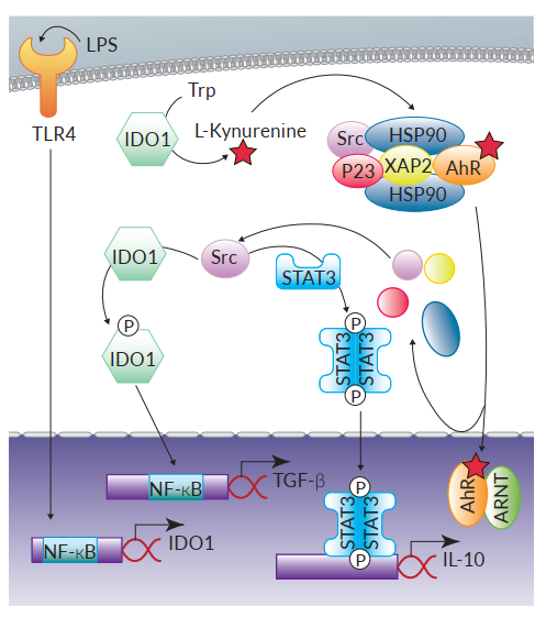 AhR參與調節促炎反應和耐受反應的機制可以從多方面解釋?zhuān)饲拔奶徇^(guò)可以導致IL-22產(chǎn)生的典型AhR信號,AhR也通過(guò)非基因組途徑導致至少兩個(gè)抑制性效果。研究發(fā)現與AhR相關(guān)的Src激酶能夠磷酸化吲哚胺2,3-雙加氧酶(IDO1),進(jìn)而激活NF-κB轉錄因子誘導DCs中抑制性細胞因子TGF-β(transforminggrowth factor)的轉錄,達到抑制小鼠對LPS的過(guò)度應答9。此外, IDO1對Trp的降解提供了例如L-型犬尿氨酸(L-Kynurenine)的AhR激動(dòng)劑,提示了這通路與Treg的產(chǎn)生有關(guān)9。在巨噬細胞中,AhR另一個(gè)抑制作用是在LPS誘導下,AhR協(xié)同Src激酶和STAT3信號通路產(chǎn)生抗炎細胞因子IL-10。值得留意的是,TLR4對LPS的識別可促進(jìn)巨噬細胞中AhR的表達,但目前尚不清楚在其他模式識別受體配體刺激的情況下是否也是如此10。