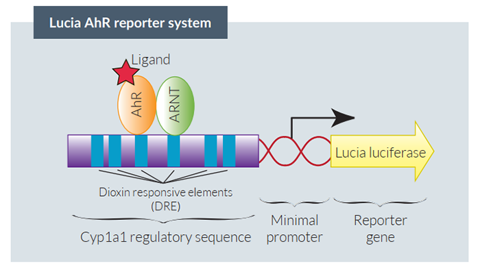 HT29-Lucia?AhR細胞和HepG2-Lucia?AhR細胞通過(guò)監測Cyp1a1誘導的Lucia熒光素酶活性提示AhR激活狀況。微粒體細胞色素P450依賴(lài)性單氧化酶Cyp1a1基因是重要的AhR靶基因,在這兩個(gè)細胞系中,Lucia熒光素酶報告基因都在人Cyp1a1的完整調控序列的控制之下。當配體結合時(shí),細胞質(zhì)AhR發(fā)生構象改變,跨膜進(jìn)入細胞核,并與ARNT結合,以結合Cyp1a1調節序列中的二惡英反應元件(DRE)。 AhR的激活可以通過(guò)QUANTI-Luc?測定細胞培養上清中分泌的熒光素酶活性來(lái)評估。HT29-Lucia? AhR細胞和 HepG2-Lucia? AhR細胞對Zeocin?具有抗性。兩種細胞系都用TCDD、FICZ、ITE和L-KynureninePlus(L-型犬尿氨酸的制備物)進(jìn)行了功能測試。