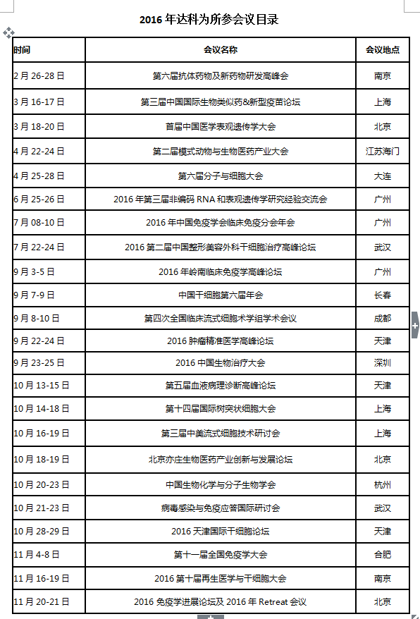 2016年達科為生物技術(shù)有限公司參展會(huì )議列表_會(huì )議速遞_實(shí)用工具_技術(shù)天地_深圳市達科為生物技術(shù)股份有限公司